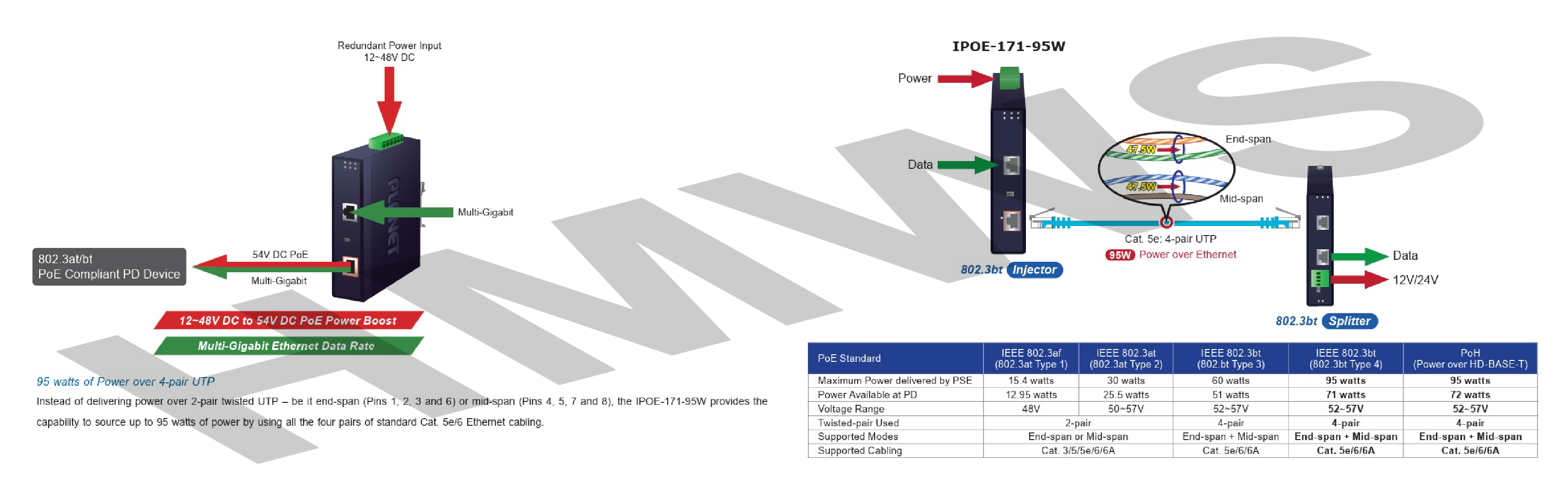 2 Multi - Gigabit RJ45 Interface, 1-Port Data + Power Output, 1-Port Data Input